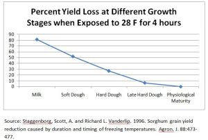Not all freezes cause the same level of damage. A light freeze may kill leaves but leave stalks intact, allowing the plant to continue filling grain. More severe freezes often result in low test weight, producing shriveled kernels that are difficult to thresh. Test weight reductions stem from an increase in broken kernels and foreign material. Grain that falls below 55 pounds per bushel cannot qualify as U.S. No. 2 grade sorghum and will be subject to price discounts, which vary with the degree of test weight reduction.
