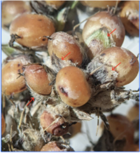 Researchers at Kansas State University asked this question and hypothesize that much of the itchiness is related to the structure of the glumes that surround each grain in the grain head. Grain sorghum glumes are covered by tiny, rigid, hair-like appendages called trichomes (figure 1). These trichomes are known to be a primary contributor to the total dust produced by cereal grains at harvest.