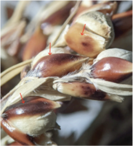 Interestingly, dust from rice grown in the U.S. in the early 1900s was known to cause itchiness. The rice varieties grown at that time had “hairy” glumes like sorghum. In the 1920s, rice varieties with “hairless” glumes gained popularity and, as a result, the dust produced at rice harvest was greatly reduced! Currently, all U.S. rice varieties have hairless glumes. The technical term for “hairless” is “glabrous.”