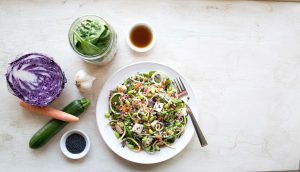 Pre-packaged grated carrots, shredded cabbage and zucchini zoodles (noodles) can be used as a time-saver.